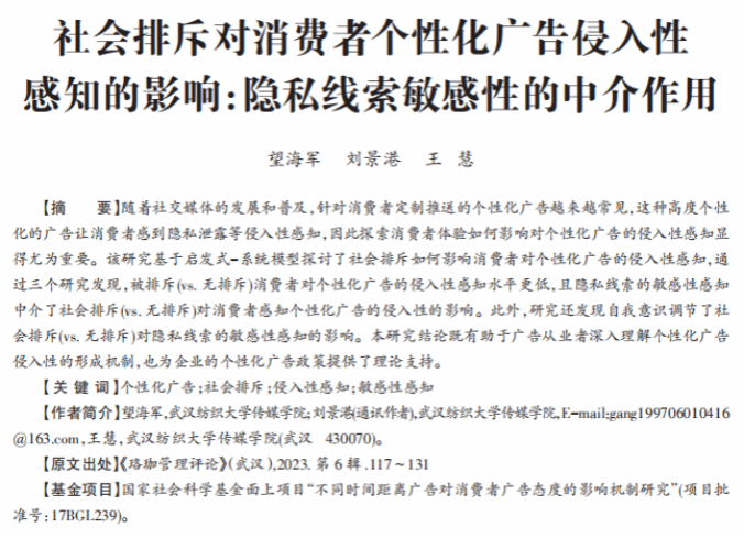 望海军教授的研究探讨了在社交媒体环境下,社会排斥如何影响消费者对个性化广告的侵入性感知。通过三个实验,该研究发现被排斥的消费者对个性化广告的侵入性感知水平较低,且隐私线索的敏感性感知在其中起到了中介作用。此外,研究还发现自我意识调节了社会排斥对隐私线索敏感性感知的影响。
