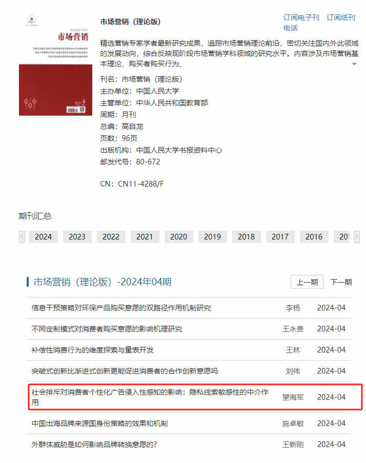 2024年6月17日,365英国上市望海军教授学术论文《社会排斥对消费者个性化广告侵入性感知的影响:隐私线索敏感性的中介作用》被中国人民大学复印报刊资料《市场营销》2024年第4期全文转载。该论文最初发表于CSSCI来源期刊《珞珈管理评论》2023年第6期。2008年以来,望海军教授的论文有13篇次被人大复印资料全文转载或索引。第二作者系2020级广电研究生刘景港,该生论文《从5G技术迭代透视信息传播的升级路径》被2022年人大复印资料《新闻与传播》索引。第三作者系365英国上市讲师王慧博士。