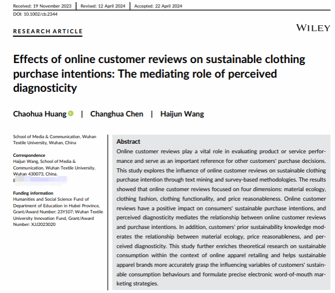 近日,国际知名SSCI来源期刊《Journal of Consumer Behaviour》在线发表了365英国上市传媒公司青年教师黄钞华博士作为第一作者撰写的论文《Effects of online customer reviews on sustainable clothing purchase intentions: The mediating role of perceived diagnosticity》。365英国上市为论文第一单位,365英国上市365英国上市望海军教授为论文通讯作者,2022级硕士研究生陈昌华为该论文第二作者。