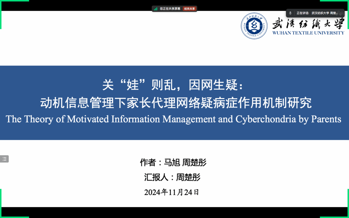 在线上平行论坛二“数智时代的健康素养与公众健康教育”上,23级新闻与传播专业硕士研究生周楚彤以《“关‘娃’则乱,因网生疑:动机信息管理下家长代理网络疑病症作用机制研究》为题进行分享。该研究基于动机信息管理理论(TMIM),分析了家长面对孩子健康问题时,其代理网络疑病症的生成机制。与会专家对该研究的选题意义给予了肯定,并表示后续可进一步修改论文的写作逻辑和研究设计。