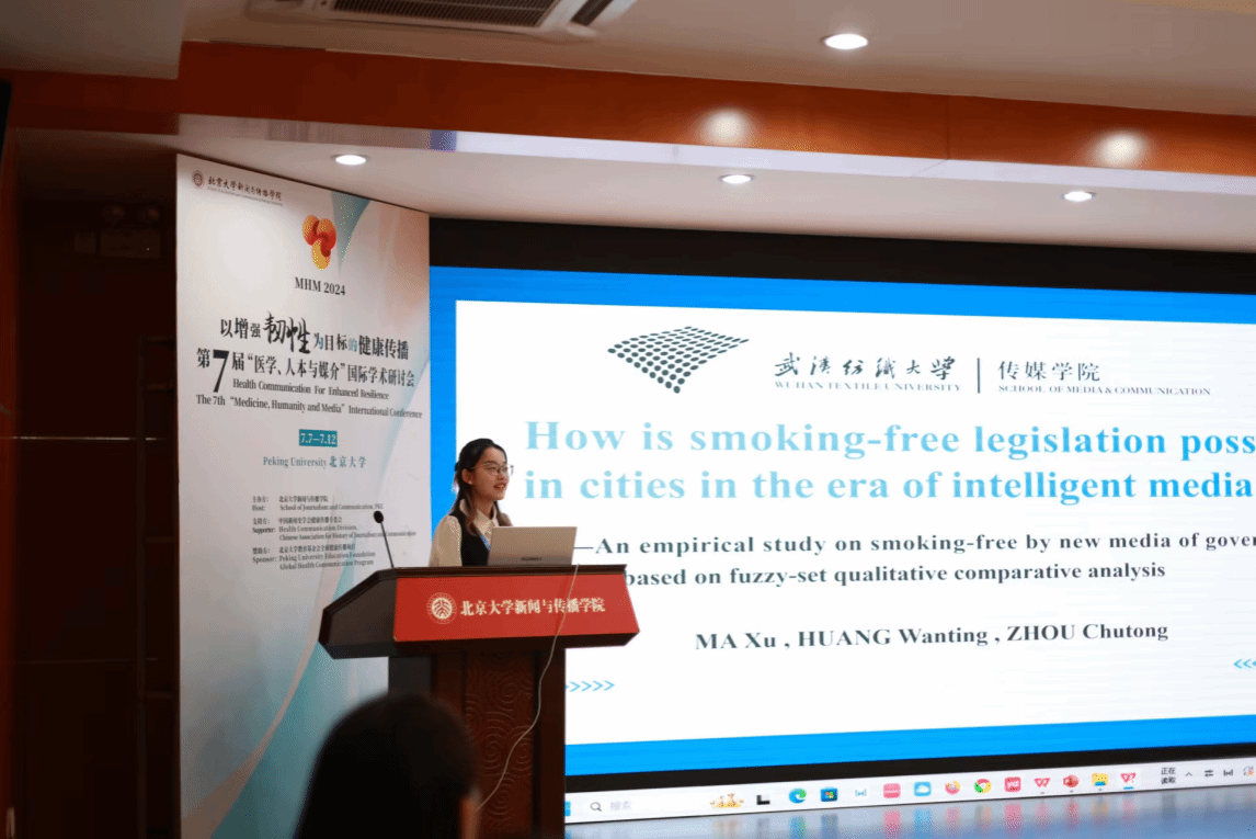 7月8日,在“社交媒体健康传播的多样化道路”分论坛上,23级广播电视专业硕士研究生黄婉婷以《How is smoking-free legislation possible in cities in the era of intelligent media ?》为题进行了精彩分享。该研究用定性比较分析的研究方法探讨了地方政务新媒体控烟实践和他城市特征变量组合对城市控烟立法的影响。与会专家认为该议题具有较强的现实意义和研究价值,后续可根植传播学角度开展研究。
