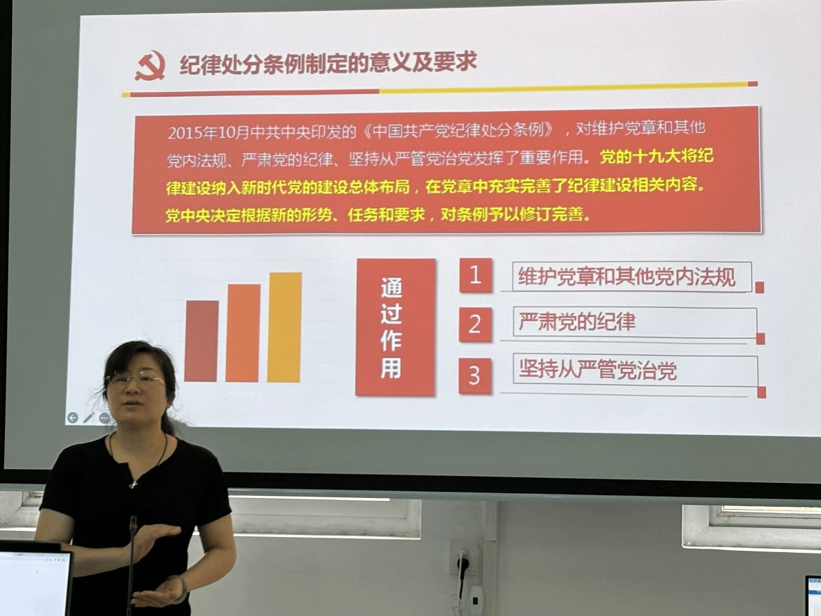 6月27日,行政教工党支部书记朱煜对“六大纪律”的条例内容进行详细解读,通过结合相关违纪典型案例,用身边事教育身边人,让教师党员受警醒、明底线、知敬畏。
