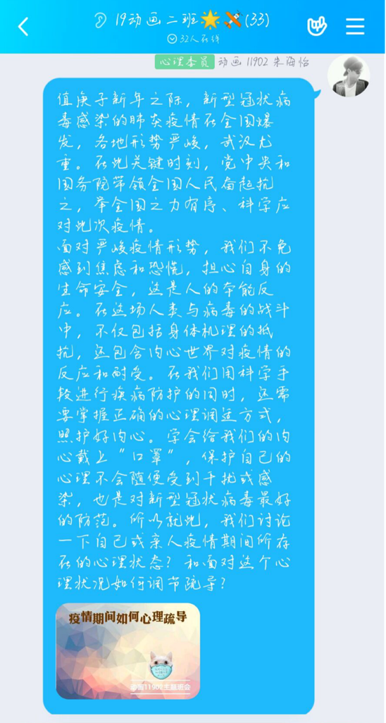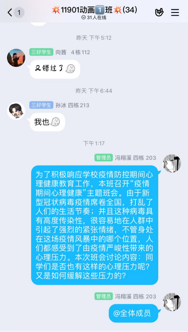 此次活动,心理工作站依托网络,指导帮助各班心理委员主持召开线上主题班会。班会上,各班针对“如何高效进行线上学习”、“抗击疫情期间易发的心理问题”等主题进行线上讨论,同学们纷纷发表见解与看法,交流心得与体会,通过积极交流,引导同学们理性看待疫情,安心宅在家中以努力学习的方式来抗疫。