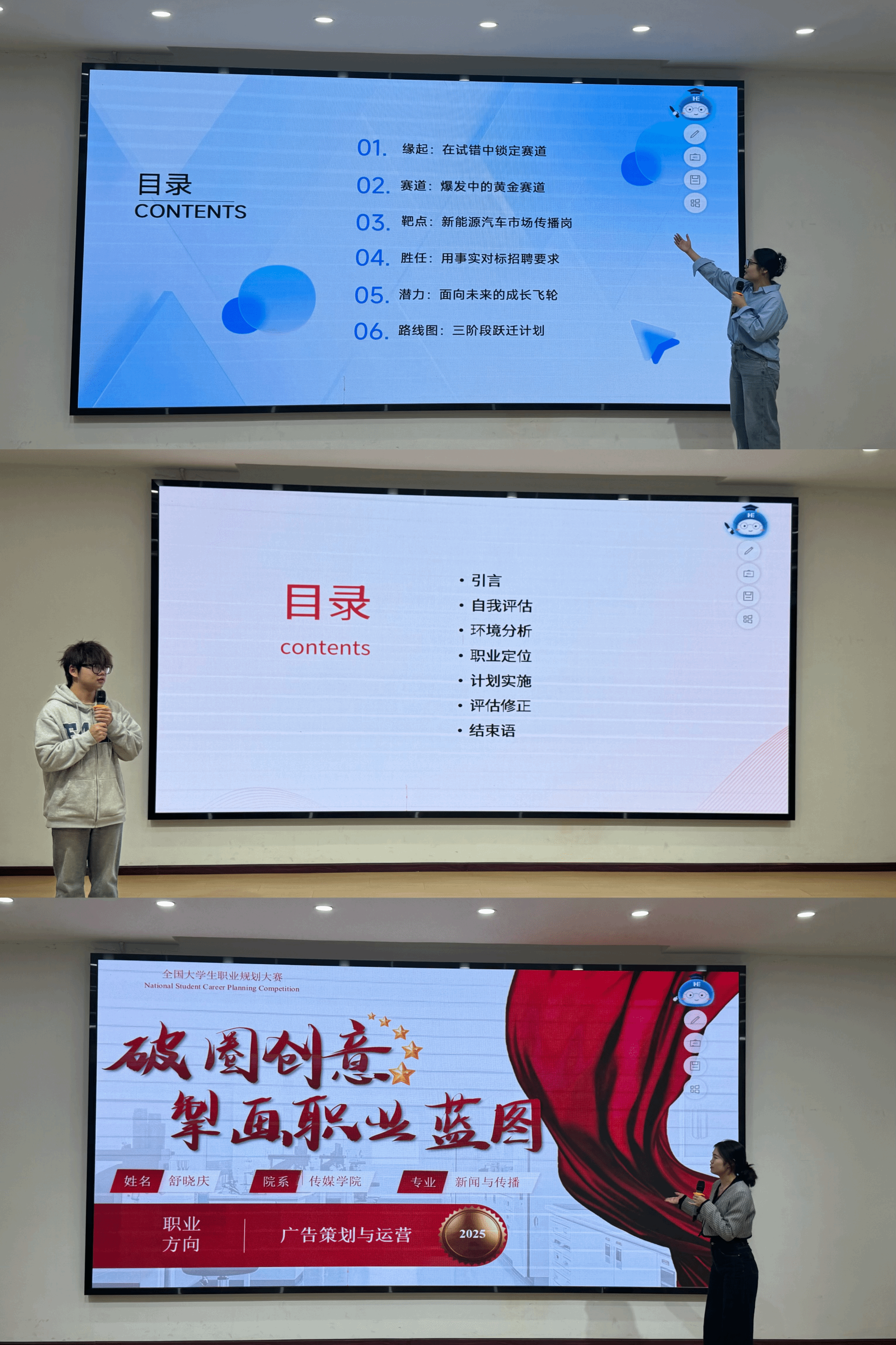 比赛自启动以来,受到了公司师生的广泛关注和积极参与。经过前期班级推荐和初赛筛选,共有来自不同年级、不同专业的六名优秀选手脱颖而出,晋级院级决赛。决赛现场,选手们结合个人兴趣、专业特长和行业前景,通过精美的PPT、清晰的陈述和从容的答辩,全方位、多角度地展示了自己的职业生涯规划。