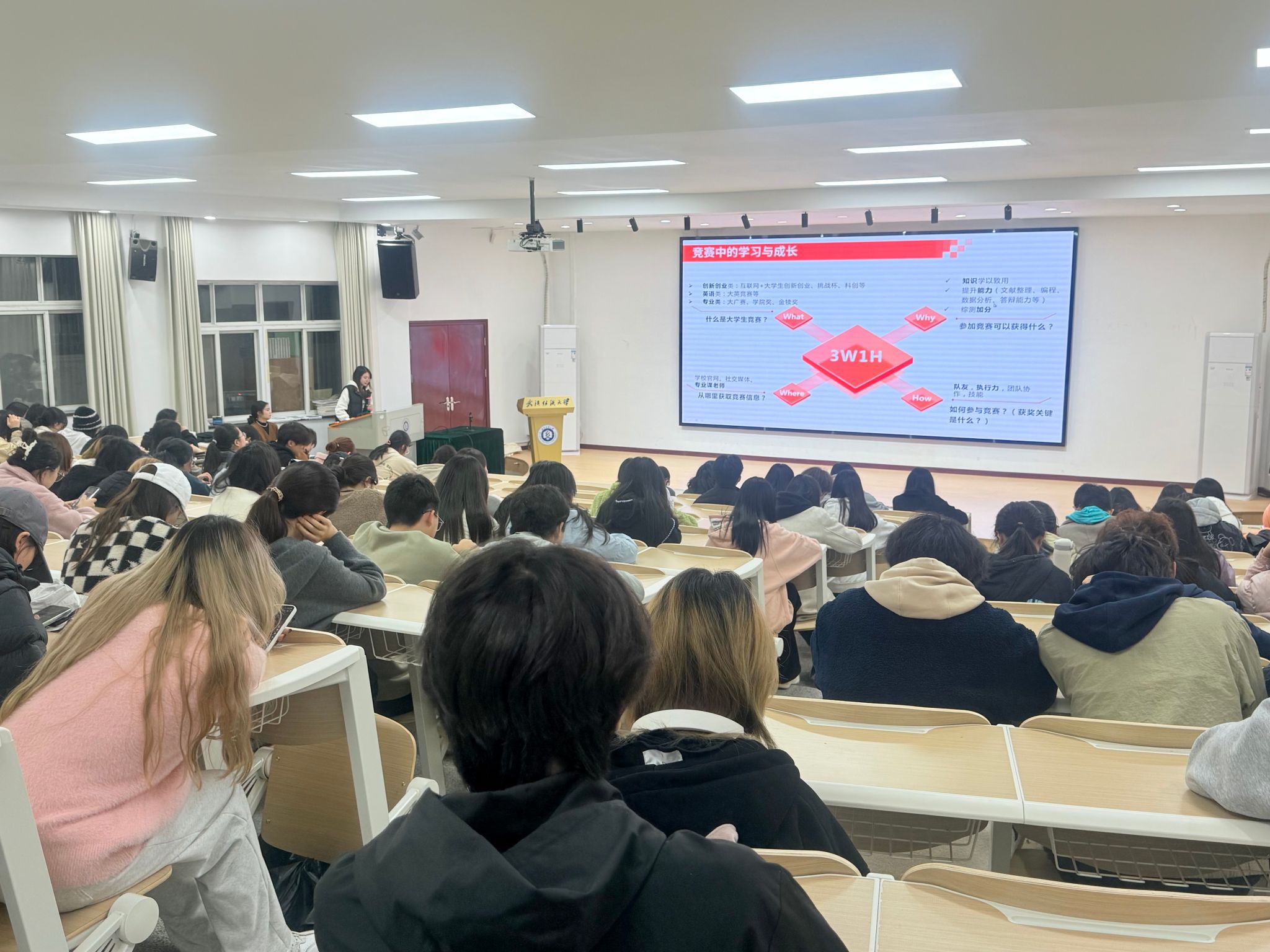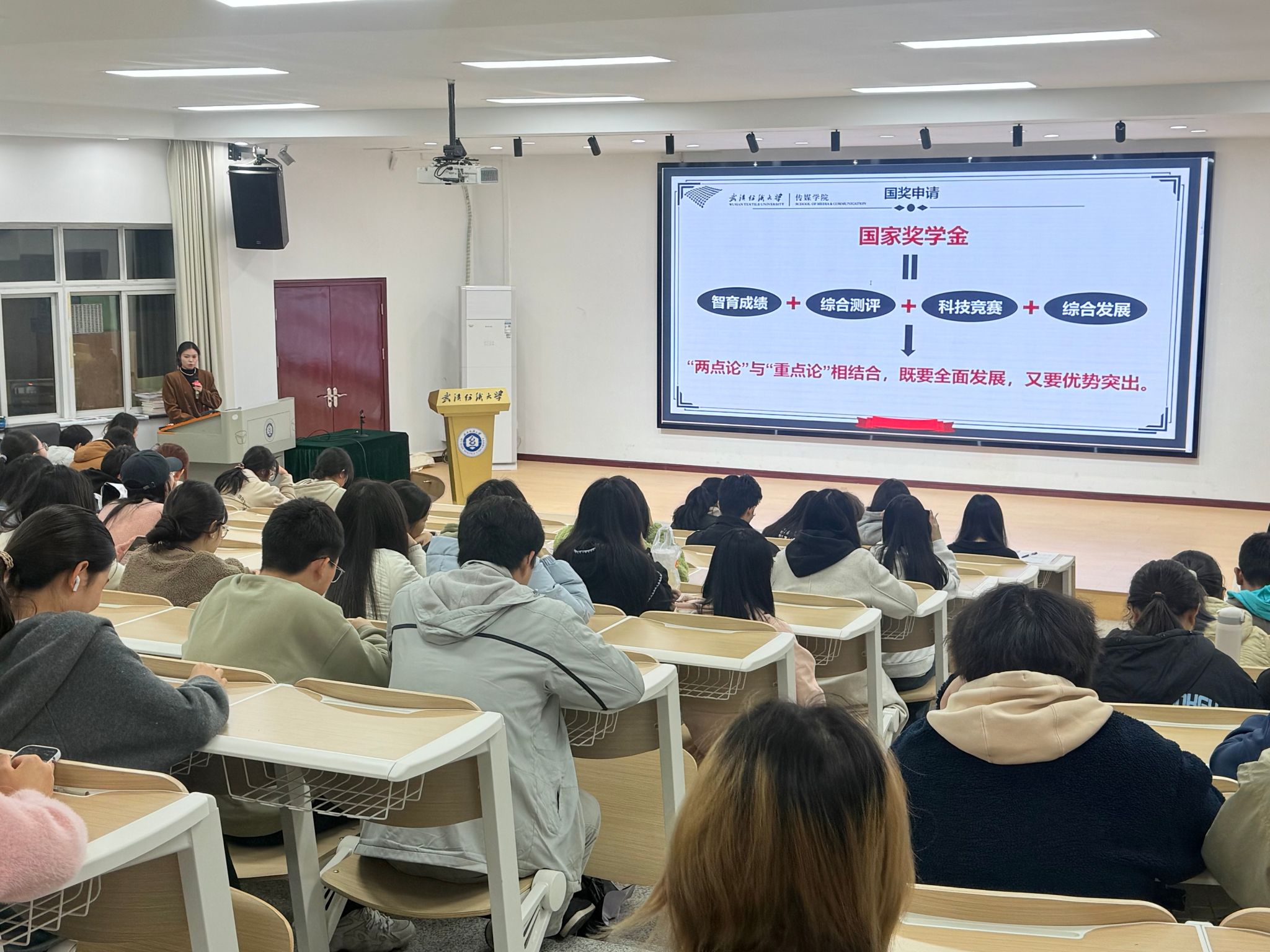 舒晓庆从国奖申请、专业学习、科研竞赛和综合发展四个方面展开分享。她介绍了国家奖学金的评定细则,提醒同学们课堂学习的重要性,强调课堂认真听讲、积极与老师交流互动是获取知识的关键。科技竞赛方面,舒晓庆详细介绍“挑战杯”、“互联网+”等赛事的参赛流程和注意事项,结合自己参与老员工广告艺术大赛、中国国际老员工创新大赛等经历,鼓励同学们打破信息壁垒,积极参与课外科技竞赛活动,以赛促学,在实践中提升专业能力。综合发展方面,她积极参与员工组织和员工社团,锻炼自身的沟通、组织和应变能力,在实践中了解社会需求,提升综合素质。