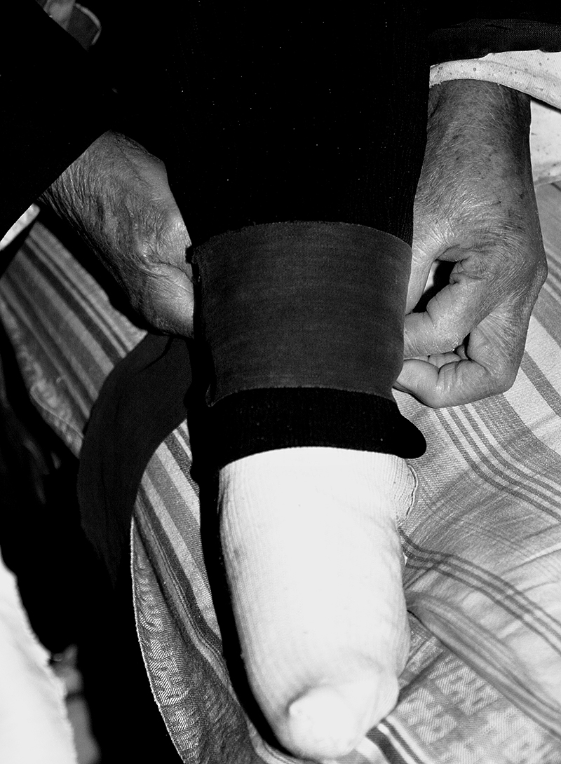 谭颖 83岁,9岁缠足,17岁时结婚,丈夫12年前去世。现在和女儿共同生活在一起,生活的很幸福。当谭颖老人谈起缠足,显得有些难过。她说,她的脚和母亲一样受缠,母亲不仅自己有着一双精制的小脚,还为谭颖缠了一双好看的小脚。至今谭颖还忘不了缠足的日子:二尺布从中间冲开,缠住、缝上,穿上木底鞋,双手扶墙,痛得浑身打哆嗦,真是另人难以忘记那段历史、、、、、、
