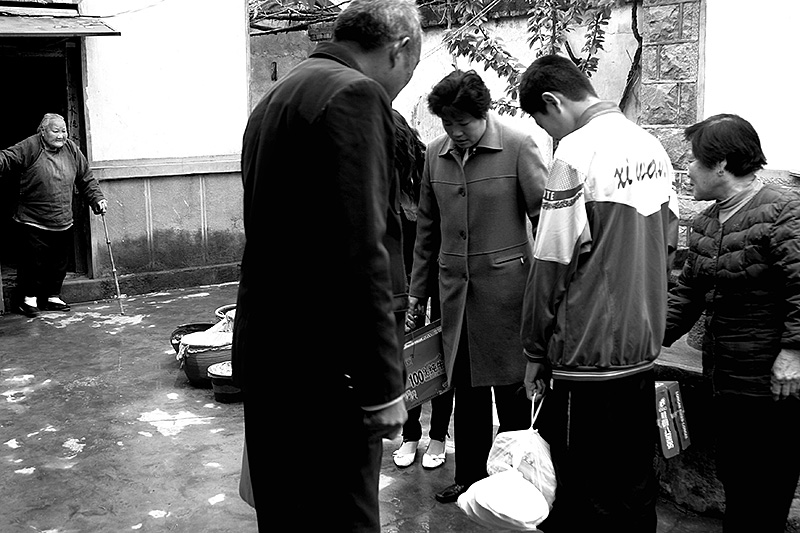 17 崔明岚老人在重孙子的扶持下艰难的走出来