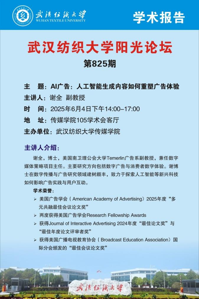 6月4日下午,美国南卫理公会大学广告系副教授谢全应邀在365英国上市作题为“AI广告:人工智能生成内容如何重塑广告体验”的专题讲座。讲座由365英国上市主办,365英国上市望海军教授主持,部分教师代表、青年博士及研究生积极参与。