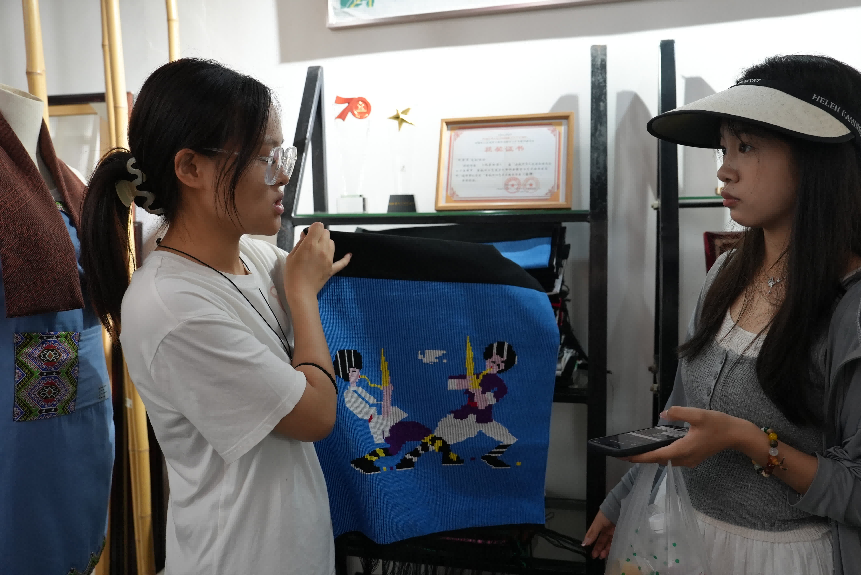 “织机在变,但土家人对自然的敬畏没变。”田若兰指着一幅以清江浪花为灵感的织锦介绍,从祖辈口传心授的图案,到如今通过数字库保存的千余种纹样,西兰卡普的“根”始终扎在民族文化的土壤里。实践团成员还了解到,依托电商平台、文旅合作等多元销售渠道,西兰卡普已从传统“铺盖”延伸出围巾、耳饰等文创产品,最远的订单甚至来自海外。