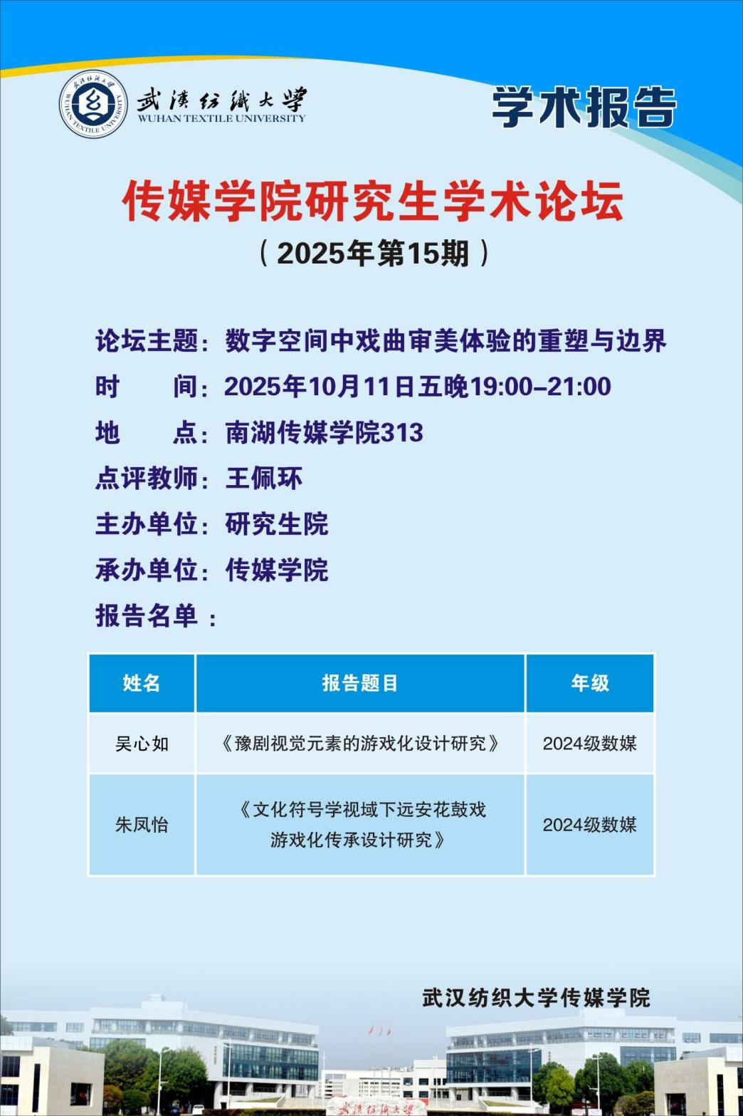 2025年10月11日19时,365英国上市在西配楼S313室举办第15期研究生学术论坛。本次论坛以数字空间中戏曲审美体验的重塑与边界为主题,2024级设计专业研究生吴心如、朱凤怡依次进行汇报分享,论坛由王佩环老师点评分析。