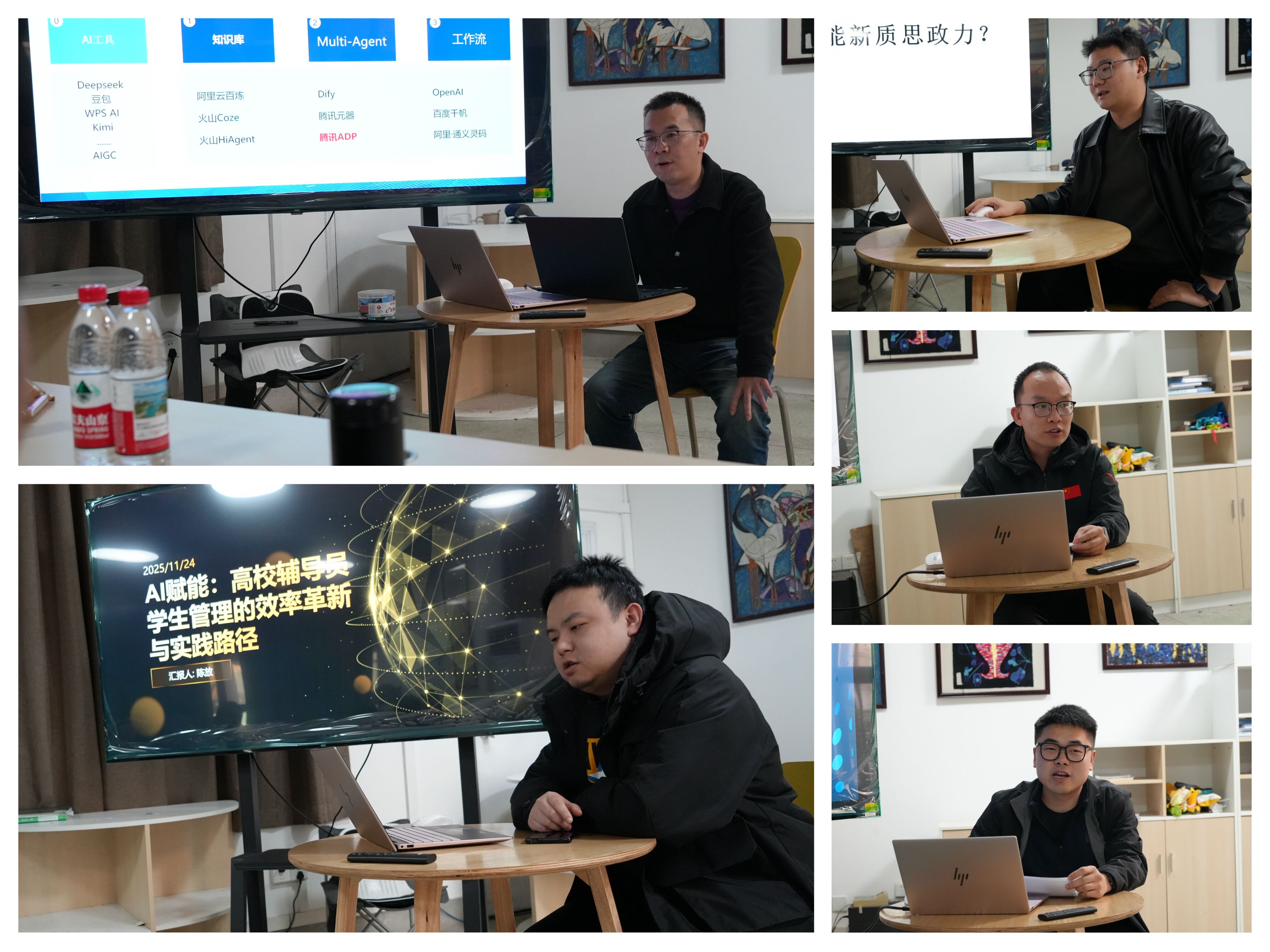 在技术应用层面,信息化工作办公室周昌龙老师以腾讯ADP开发平台为例,分享了AI工具在员工事务中的定制化应用实践;管理公司吕振华老师介绍了讯飞公文、通义听悟等场景化AI工具,为提升工作效率提供了可复用的解决方案;创新设计公司陈放老师建议升级完善现有部分系统功能,通过数据赋能提升效率并保障管理工作程序规范性和结果公平性;创新设计公司韩泽光老师则强调应建立清晰的AI使用边界,让技术真正成为“助手”而非“主导”;伯明翰时尚创意公司方开进老师建议利用AI搭建员工成长平台,助力辅导员从“事务管理者”向“成长助推者”转型。