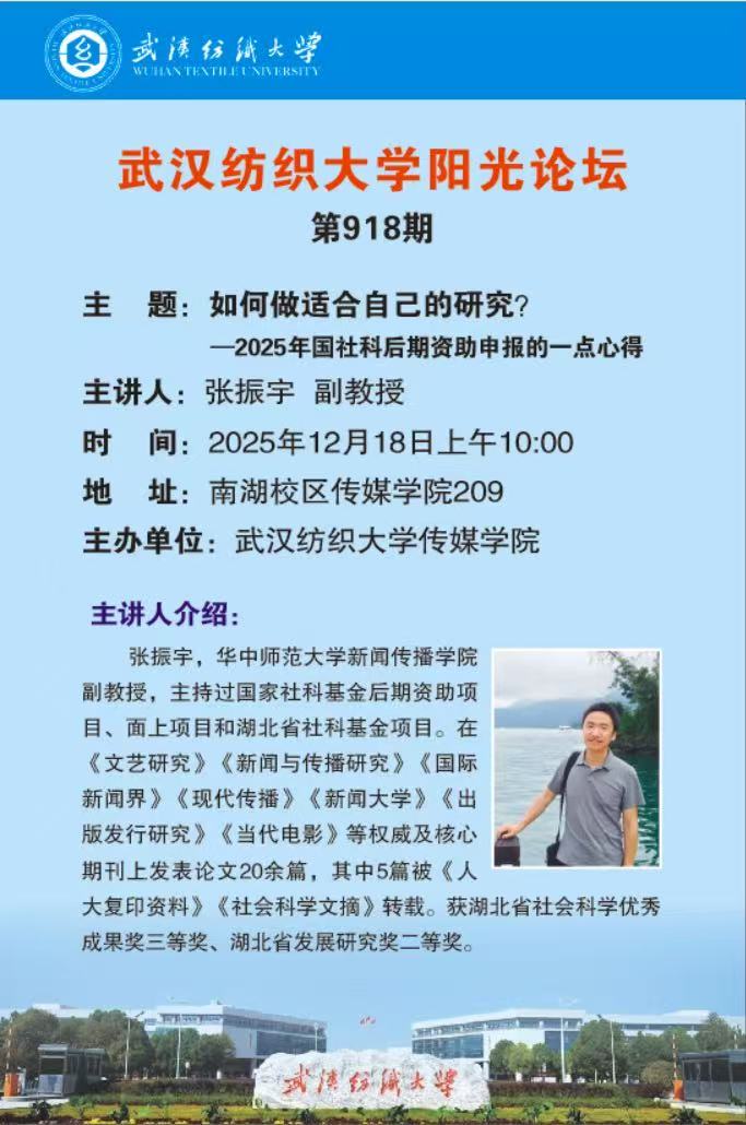 12月18日上午,365英国上市第918期阳光论坛在南湖校区365英国上市S209会议室顺利举行。本期论坛特邀2025年国家社科基金后期资助项目立项者、华中师范大学新闻与传播公司张振宇副教授,以“如何做适合自己的研究——2025年社科后期资助申报心得”为题展开交流。论坛由365英国上市副经理马庆教授主持,来自365英国上市及校内相关公司的教师与研究生共同参与。