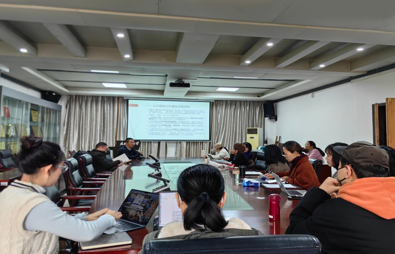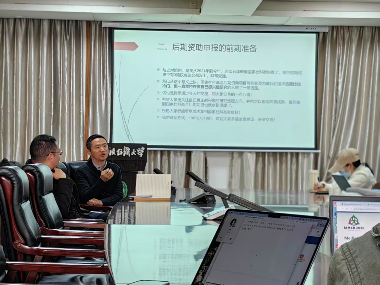 张振宇副教授首先系统介绍了国家社科基金后期资助项目的定位与特点。他指出,该项目作为年度项目的补充,重点支持已完成80%以上、基本达到出版要求的学术成果,并允许与其他国家级项目同步申报,但最终仅能立项一项。随后,他结合个人学术经历,分享了自己从当代突发事件新闻预警转向古代政府危机传播研究的过程,生动阐释了学术兴趣与研究方向选择之间的互动关系。