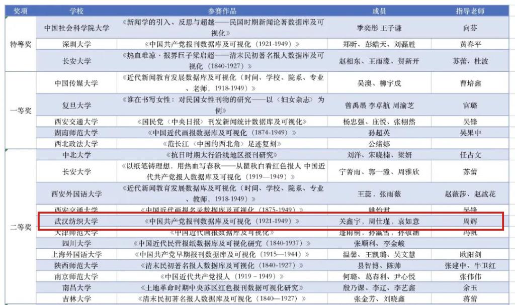 5月7日下午,在西安交通大学举办的第二届中国新闻史知识数据库建设及可视化设计决赛上,公司关鑫宇、周仕瑾,袁如意三位同学组成的“爱党组”团队创作的互动类作品《中国共产党报刊数据库及可视化(1921-1949) 》最终喜获此次大赛二等奖。