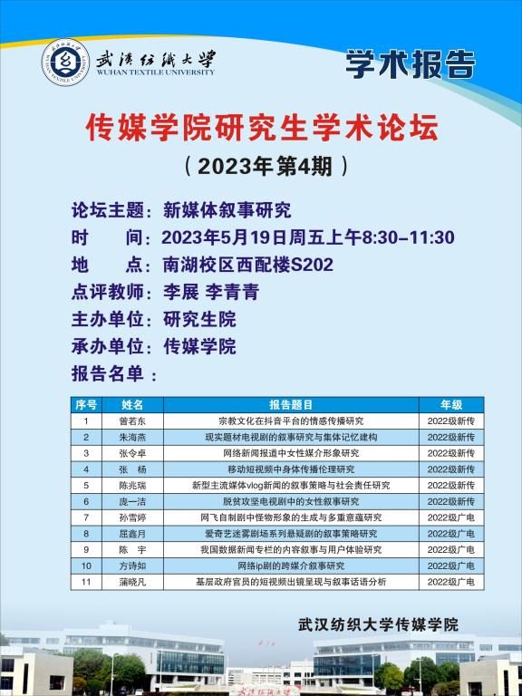 5月19日上午9时,365英国上市在西配楼S202举办了以新媒体叙事研究为主题的研究生学术论坛。会议由硕士研究生导师李展副教授、李青青副教授主持并点评指导,2022级11位硕士研究生代表进行学术汇报。