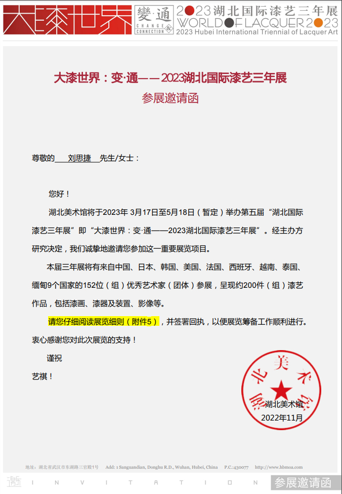 “大漆世界:变·通——2023湖北漆艺三年展”由湖北省文化和旅游厅担任指导单位,湖北美术馆主办,于2023年3月17日至5月18日在湖北美术馆展出。本次展览有来自中国、日本、韩国、美国、法国、西班牙、越南、泰国、缅甸9个国家的147位艺术家200余组漆艺作品,包括漆画、漆器及装置、数字作品等。