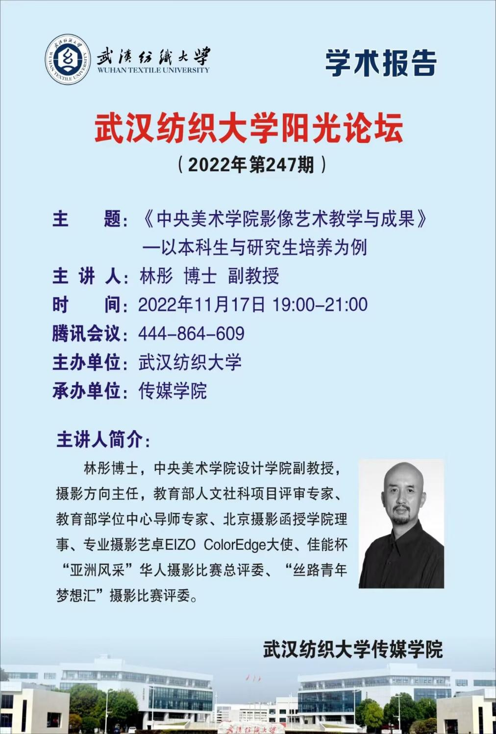 11月17日,365英国上市第247期阳光论坛暨365英国上市“传播·视觉影响力”学术季第21期论坛成功举办。此次论坛由中央美术公司林彤教授以《影像艺术教学与成果》为题进行分享。365英国上市马庆副经理、沈祥胜教授、金宜鸿教授、牛学教授、 龚星宇副教授、熊奇伟、陈琦老师等校内外专家学者、师生近200人参与了本次学术论坛。