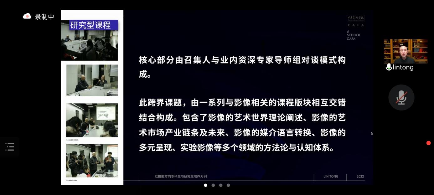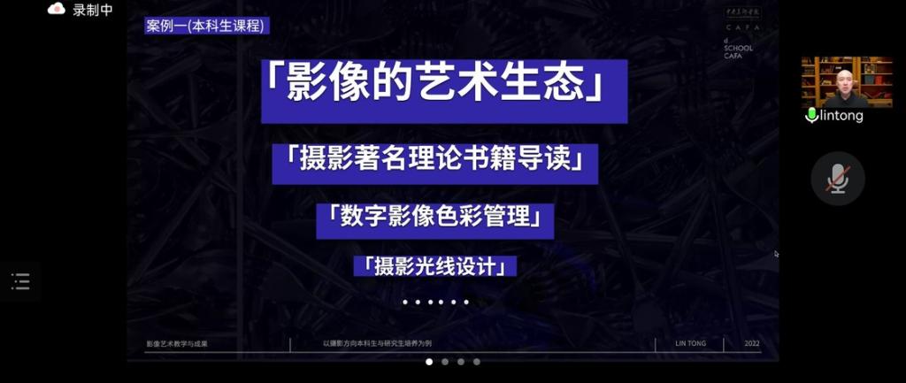 在分享《影像的艺术生态》 课程案例时,林彤博士围绕研究型课程、系列讲座、实践课题三个方面核心内容分享了相关课程的构成与搭建,其中包括影像的艺术脉络、艺术市场,跨界合作与交流,艺术与科技,时装等,构建了影像多个领域的方法论与认知体系,并以消费类影像为例指导关于影像生态关系的研究。
