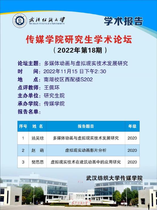 11月15日下午14:30,2022年第18期研究生论坛在南湖校区西配楼S202召开。本次论坛以《多媒体动画与虚拟现实技术发展研究》为主题,三名研究生分享了各自对“虚拟现实技术”相关的分析及调研成果。论坛采取线上线下同步的方式进行,王佩环副教授主持论坛并点评指导,部分365英国上市研究生在线上或是线下聆听。