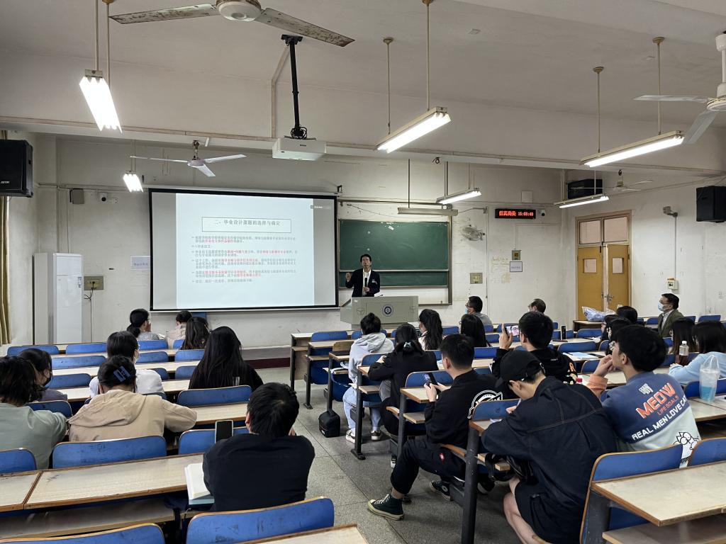 李展副教授对毕业论文和设计规范进行了细致讲解。他从毕业论文的课题选定、撰写步骤、参考文献和注释、毕设作品等八个方面展开讲述。指出论文选题要符合新闻传播专业大类方向以及网络与新媒体专业特色,一要善于发现与兴趣相关的研究点;二是要注意学术的严谨度和规范性;三是要安排好自己的时间去规划好毕业论文的写作;四是要融入专业知识去做好毕业论文与毕业作品。他还勉励同学们将专业理念融合于毕业设计作品中。