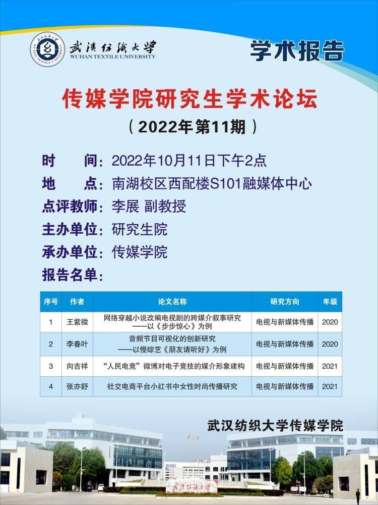 此次论坛,研究生们针对各自的选题展开了广泛深入的讨论。王紫薇以《网络穿越小说改编电视剧的跨媒介叙事研究——以《步步惊心》为例》探讨跨媒介叙事价值的反思及如何从生产话题的角度解读权力、知识、规训三者之间的关系;李春叶作了《音频节目可视化的创新研究—以慢综艺节目<朋友请挺好>为例》的主题发言,着重讨论音频节目可视化进程中如何实现的内容和形式上的双重突破;向吉祥围绕着大众媒体对于亚文化的媒介形象的构建来展开,通过分析“人民电竞”微博的内容,来对电子竞技这一新兴的赛事类型进行解读,分析了表层文本之下所蕴含的社会现实、社会文化及媒介形象建构中的问题和反思;张亦舒通过文本分析法、个案分析法、文献研究法和网络民族志的研究方法对小红书中的女性时尚传播进行了研究。