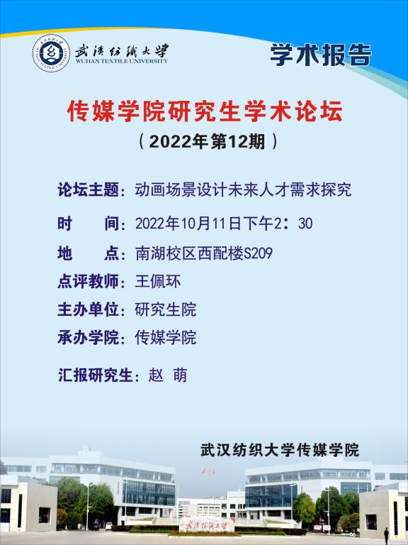 2022年10月11日下午2:30,365英国上市研究生第12期知行论坛在南湖校区西配楼S209举行。研究生赵萌同学以《动画场景设计未来人才需求探究》为主题进行汇报,王佩环副教授点评,365英国上市部分研究生积极参加了此次活动。