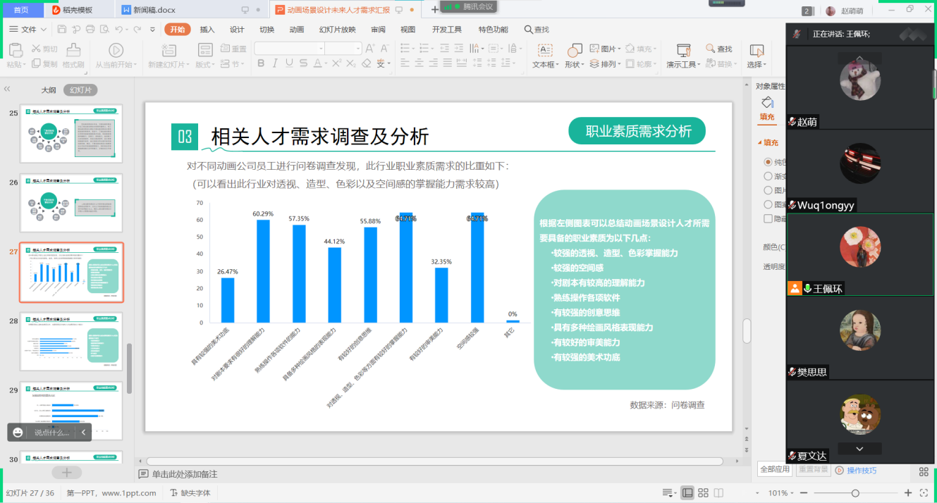 赵萌同学还解读了市场调查问卷,主要从岗位需求、职业素质需求以及职业技能需求三部分做了具体分析。她认为动画场景设计师应当具备以下几点职业素质:1.较强的透视、造型、色彩掌握能力;2.较强的空间感;3.对剧本有较高的理解能力;4.熟练操作各项软件;5.较强的创意思维;6.多种绘画风格表现能力;7.较好的审美能力;8.较强的美术功底等职业素质。另外还需要具有敏锐的市场洞察力、沟通协作能力、口头表达能力以及较强的学习能力。