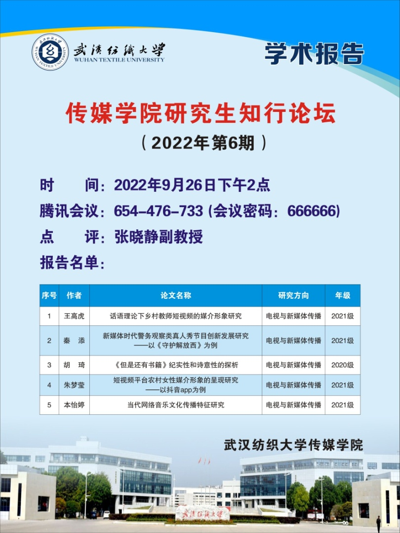 参与本次论坛的五名研究生王高虎、秦添、胡琦、朱梦莹、本怡婷分别就“话语理论下乡村教师短视频的媒介形象研究”、“新媒体时代警务观察类真人秀节目创新发展研究——以《守护解放西》为例”、“《但是还有书籍》纪实性和诗意性的探析”、“短视频平台农村女性媒介形象的呈现研究——以抖音app为例”、“当代网络音乐文化传播特征研究”五个主题进行汇报,展示了研究生广泛的研究兴趣与良好的科研氛围。