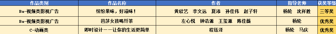2109班的黄欣艺、李文远、夏添、孙佳伟、赵子轩同学共同创作、杨轮老师指导的作品《缤纷果味,好滋味!》获视频类影视广告国赛三等奖。该作品为三维渲染动画。通过镜头中对相应水果的适量夸张变形以及水果与产品间的不断变换增强视觉效果,画面中饱满多汁的水果引发观者的食欲,同时采用鼓点音乐卡点剪辑的方式产生韵律感与节奏感,达到视觉与听觉的高度融合。