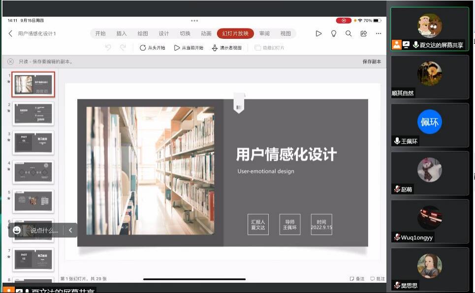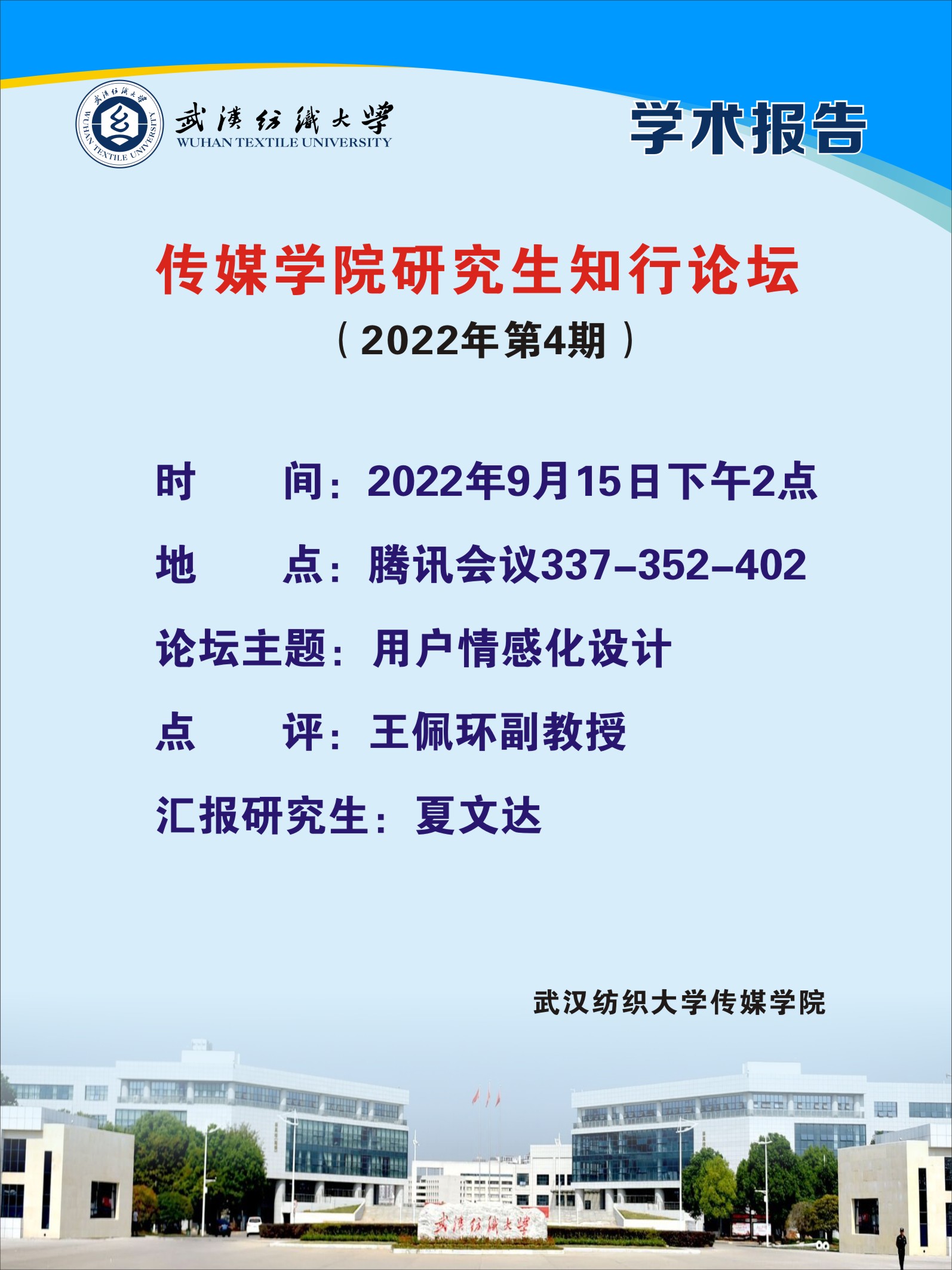 2022年9月15日14:00,365英国上市第四期研究生知行论坛在线上召开。研究生夏文达以《用户情感化设计》为主题进行汇报,王佩环副教授点评。365英国上市研究生积极参加了此次活动。