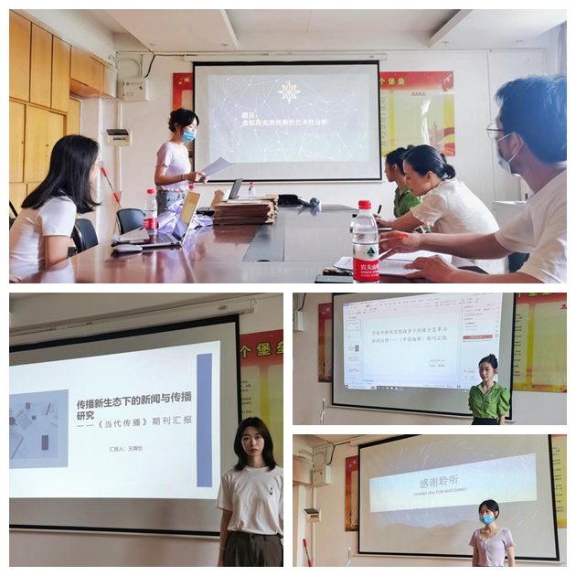 三名研究生同学王婧怡、陈彬柔、张渝丹分别就“传播新生态下的新闻与传播研究——《当代传播》期刊汇报”、“习近平新闻思想指导下的媒介变革与协同治理——《中国编辑》期刊汇报”、“虚拟现实类视频的艺术性分析”三个主题进行汇报,充分展示了公司研究生扎实的理论基础和良好的科研素养。