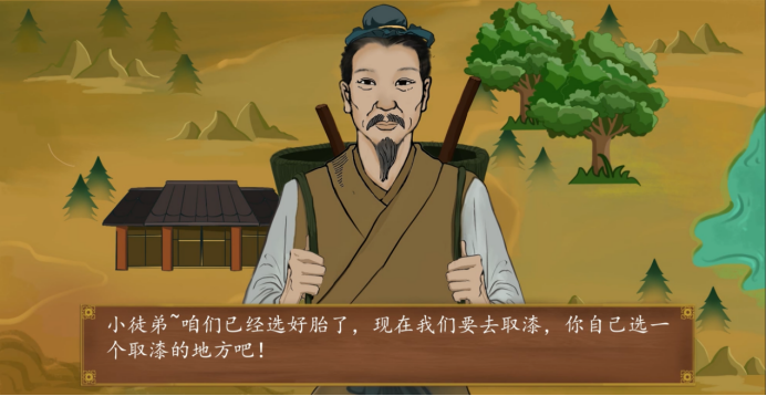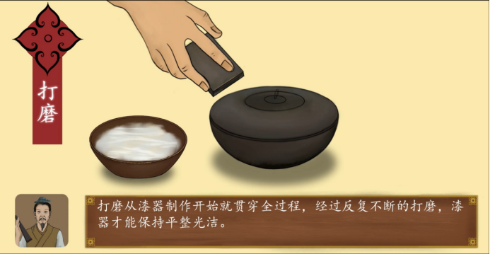 在交互视频设置四个角色,分别是楚王、大夫、士兵和国人,对应四则故事线,展示虎座鸟架鼓、漆木樽、猪形酒具壶等楚漆器产品,讲述楚人与楚漆器密不可分的生活联系。互动游戏中,参与者不仅能看到漆器实物,还能在NPC(非玩家角色)的带领下体验漆器的制作过程,不知不觉中穿越千年,沉浸于漆器之美。