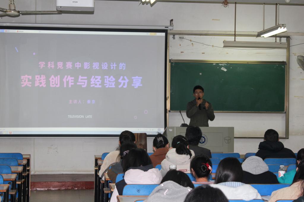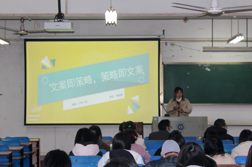 邹亚敏同学以《文案即策略,策略即文案》为主题,用众多案例展示了在广告设计中文案的重要性,她认为文案就是广告策略,还给大家展现了一些创作文案的策略。秦京同学讲解了《学科竞赛中影视设计的实践创作与经验分享》,他着手于在学科竞赛中的一些实践技巧和经验,结合获奖作品,为同学们以后参加竞赛提供了有用的借鉴。车爽同学以《市场热点财经新闻的采访与写作》为题,分享了自己在实习时的所见所闻,她一步步剖析自己发表的新闻稿的创作过程,带同学沉浸式了解一篇新闻诞生的完整过程,最后又为同学们分享采访过程的小技巧。