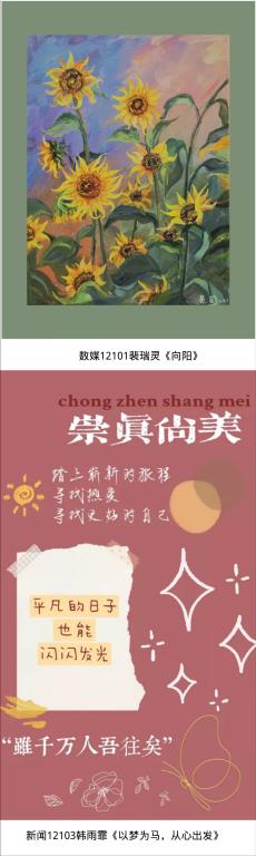 至此“传媒艺术节·新生力活动季”圆满落幕,每一份作品都展现了传媒学子风采,体现了他们的家国情怀、人生展望。活动虽已结束,但新生活才刚刚启航,希望他们能够在接下来的学习生活中,不忘初心、积极进取,传承传媒精神,实现人生理想。