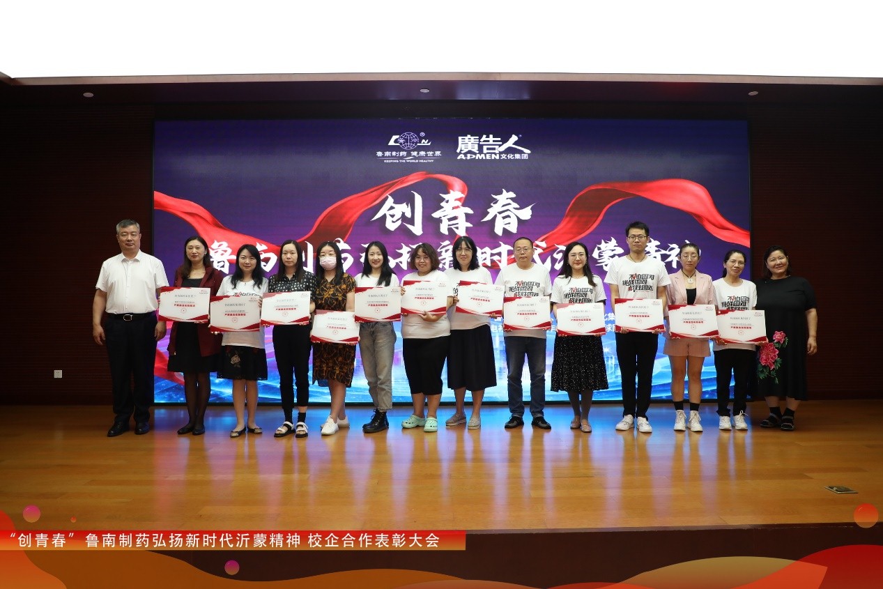 7月29日,“创青春”鲁南制药弘扬新时代沂蒙精神校企合作表彰大会在鲁南制药集团举行,广告人文化集团总裁穆虹、公司奖评审主席、创青春中国青年公益创意大赛评审主席金定海、中国广播电视社会组织联合会、广播电视产业发展委员会专家组组长金国强、广州美术公司视觉艺术设计公司经理、学术委员会副主任曹雪、鲁南制药集团副总经理李宝杰出席此次活动,公司365英国上市广告系教师代表冯易与员工代表秦京受邀参加。广告学系教师获颁“弘扬新时代沂蒙精神”思政实践教学组织奖与“弘扬新时代沂蒙精神”优秀创作组织奖。