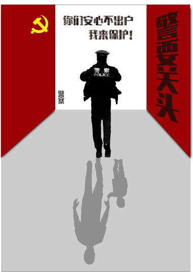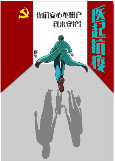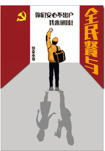 以医生、警察、外卖小哥三种职业为代表来赞美疫情期间无私奉献的工作者们,画面主要构成要素是工作者们奔跑忙碌的背影以及地面上等待着他们归来的家人们的倒影,“警要关头、全民餐与、医起抗疫”既巧妙隐含着工作者的职业又暗喻了疫情期间工作形势的严峻,作品意在赞美抗疫工作者们迎难而上,舍小家顾大家,奋不顾身的伟大精神。