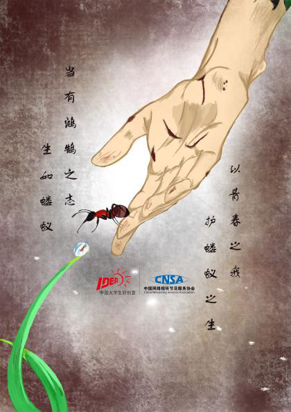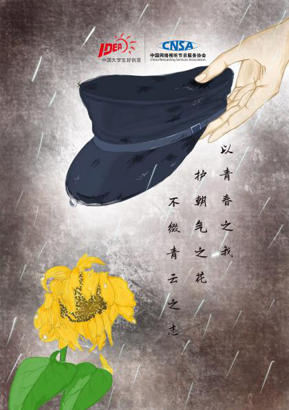 创意来源于李大钊先生在《青春》一文中写到的“以青春之我,创建青春之家庭,青春之国家,青春之民族”,五四时期的新青年们忧国忧民,不屈不挠,他们“生如蝼蚁,却有鸿鹄之志”,以己之力护卫国家和人民;枯萎的向日葵和蝼蚁象征五四运动中的新生力量,共产党先驱们以一己之力不畏艰难,“以青春之我,护蝼蚁之生”、“以青春之我,护朝气之花”,风雨中呵护和培育新生的革命力量为了个性和民族解放不懈奋斗,他们用进步的,善的,相爱互助的精神推动着文化启蒙和救亡图存。