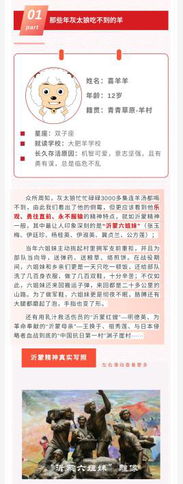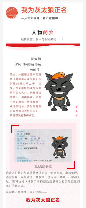 《我为灰太狼正名——从灰太狼身上学习沂蒙精神》:在这样快节奏的生活方式下,尤其是本次的目标受众“年轻群体”对许多红色文化不甚了解也缺乏关注,所以这个推文代入一个我们都熟知的动画人物——灰太狼,再结合它的形象特点挖掘它与沂蒙精神的相同之处,而灰太狼本来的反面形象又会让受众有极大的兴趣来了解我们“正名”正的是什么,从而在为灰太狼正名的同时弘扬沂蒙精神并引出新时代沂蒙精神对当代青年群体的实际意义。