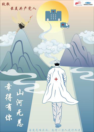 作品立意是致敬最美共产党人,立足于“幸得有你,山河无恙”,画面的主要元素由壮丽山河构成,守卫一方平安的红军与救死扶伤的医护工作者在危难关头冲锋陷阵,守护国家和人民的安全,他们伟岸而挺拔的逆行的背影是人民最坚实的依靠。作品意在赞美优秀的共产党人国家和人民需要的时候迎难而上、奋不顾身的伟大精神。