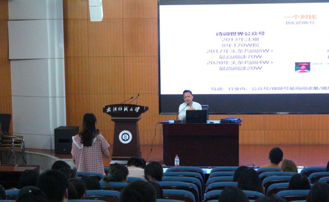 讲座伊始,魏贵芳先生分享了自己在《知音》等知名报刊的从业经历,以及转型新媒体先后创办“诗词世界”等多个文化、情感、教育领域新媒体大号的一些成绩,告诉同学们 “新媒体行业的发展是大势所趋。”随后提问“什么叫新媒体”和“为什么要做新媒体”,引发在座传媒学子思考,纷纷运用自己的专业所学进行回答,魏先生也根据回答表达出自己的看法:“在大众传媒时代,新媒体发展迅速,想在传媒行业有所获得,就必须要提高能力,抓住时机。”后讲述了自己从传统媒体向新媒体转变历程中的收获——“掌握新媒体全能技术,收入剧增以及事业创新性发展”。强调了做新媒体必须要具备良好的写作能力,敏捷的热点捕获能力和大胆的创新能力等,建议同学要尽量多方位学习技能,让自己成为全能化人才,从而适应媒体行业的新需求。