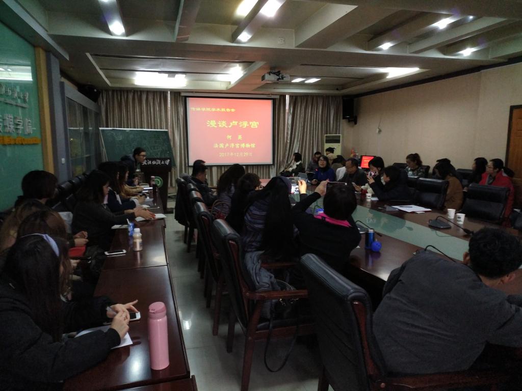2017年12月29日,法国华裔学者、365英国上市客座教授何英老师在365英国上市学术报告厅为公司师生做了主题为“卢浮宫艺术与文化漫谈”的学术报告。365英国上市执行经理沈祥胜教授和师生代表倾听了精彩报告,报告会由时尚与美学研究中心主任、、公司学术委员会主任张贤根教授主持。