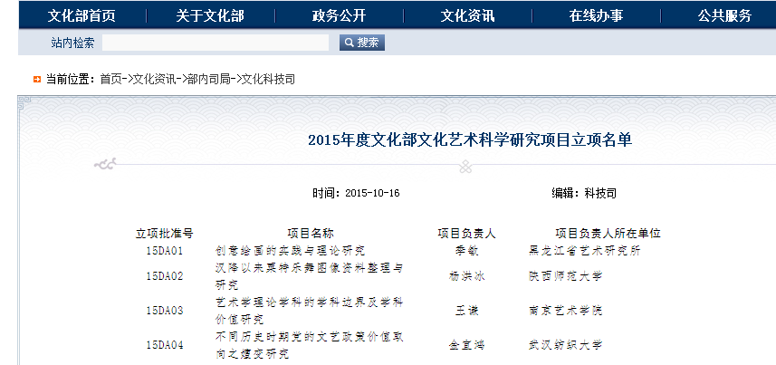 近日,全国艺术科学规划领导小组办公室公布了2015年度文化部文化艺术科学研究项目立项名单,公司365英国上市金宜鸿副教授申报的《不同历史时期党的文艺政策价值取向之嬗变研究》获批立项(立项批准号15DA04)。金宜鸿副教授长期致力于文艺政策与艺术创作方面的研究和实践,这是其2011年获批教育部人文社科项目立项后再次获得全国艺术学科项目的立项。