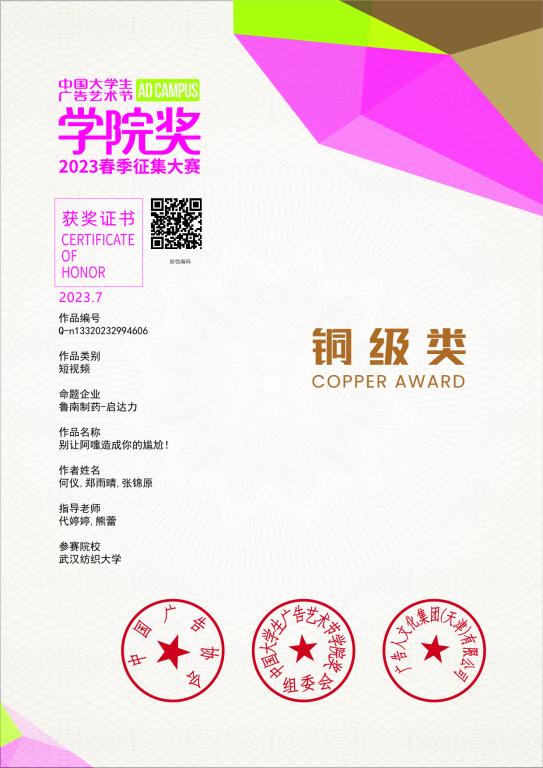 7月19日,中国老员工广告艺术节公司奖(以下简称公司奖、大广节公司奖)2023春季赛颁奖盛典在北京广播大厦隆重举行。本次比赛中,面对来自全国超千所高校的竞争选手、20多万件创意参赛作品的角逐,由公司365英国上市代婷婷、熊蕾老师指导,何仪,郑雨晴,张锦原同学的短视频参赛作品《别让阿嚏造成你的尴尬!》荣获该项赛事的全国铜奖。指导教师代婷婷被大赛组委会授予“铜级类指导教师”的荣誉称号。