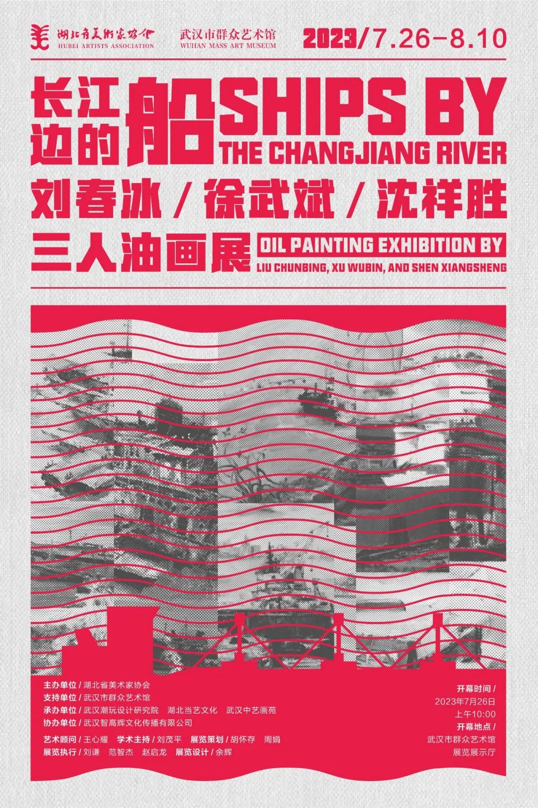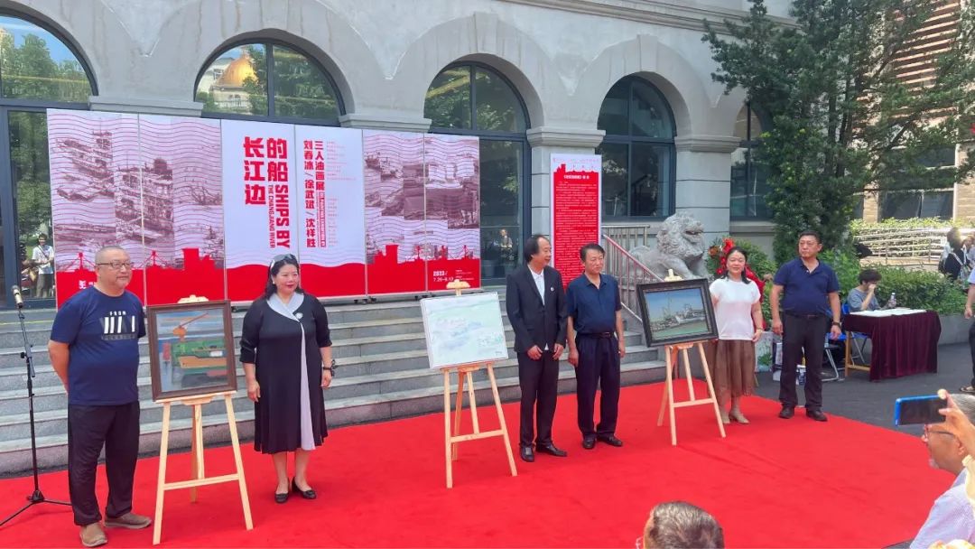 2023年7月26日上午10点,“长江边的船”——刘春冰、徐武斌、沈祥胜三人油画展在武汉市群众艺术馆展览展示厅开幕。开幕仪式由湖北省美术家协会副秘书长曾薇女士主持。主持人曾薇介绍到场艺术家及嘉宾后,江汉大学美术公司经理,汤湖美术馆馆长,此次展览的艺术顾问王心耀先生及中国美协理事、湖北省美协顾问、武汉潮玩设计研究院经理刘春冰教授致辞,湖北美术公司原经理、教授、博导徐勇民宣布画展开幕。