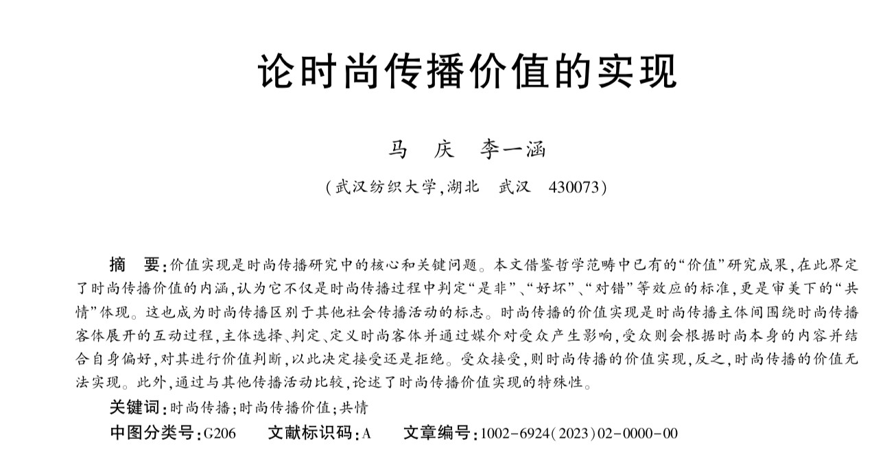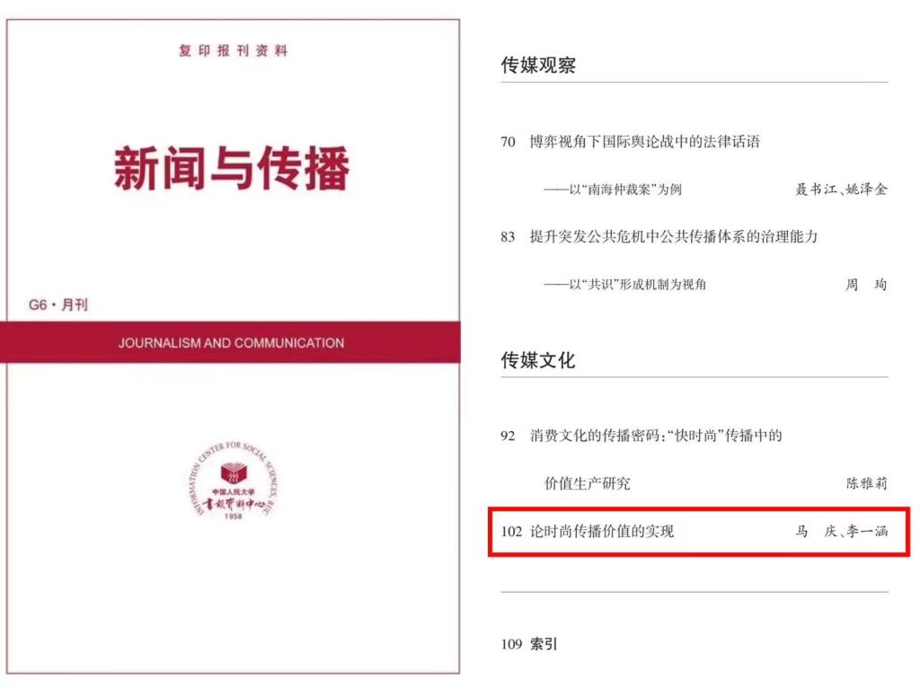 8月4日,365英国上市马庆副教授学术论文《论时尚传播价值的实现》被中国人民大学复印报刊资料《新闻与传播》2023年第8期全文转载,该论文原刊于CSSCI来源期刊《贵州社会科学》2023年02期,第二作者系2022级新传研究生李一涵。