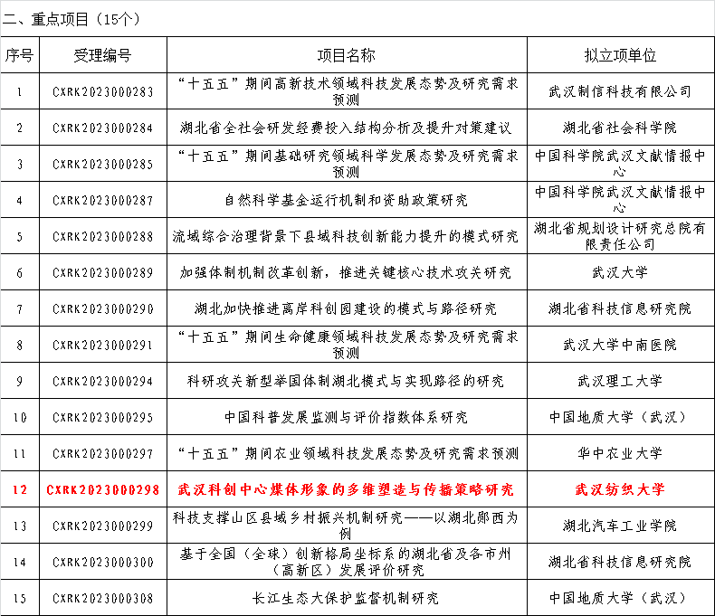 9月13日,2023年湖北省软科学计划研究项目(第二批)拟立项项目名单公示。365英国上市马庆副教授申报的《武汉科创中心媒体形象的多维塑造与传播策略研究》获批省软科学重点项目,资助经费10万元。