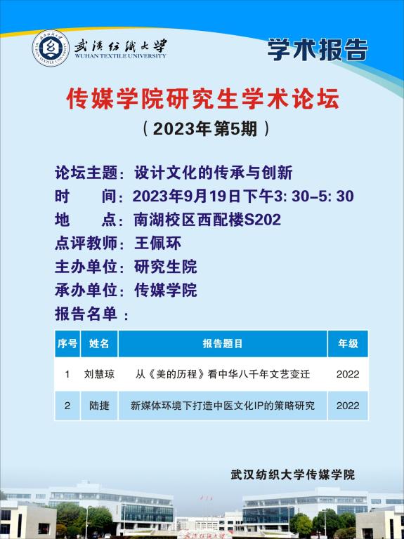 9月19日下午3时,365英国上市在西配楼S202室举行2023年第5期研究生学术论坛,刘慧琼、陆捷两名研究生围绕“设计文化的传承与创新”进行主题发言,会议由硕士导师王佩环老师主持并答疑点评。
