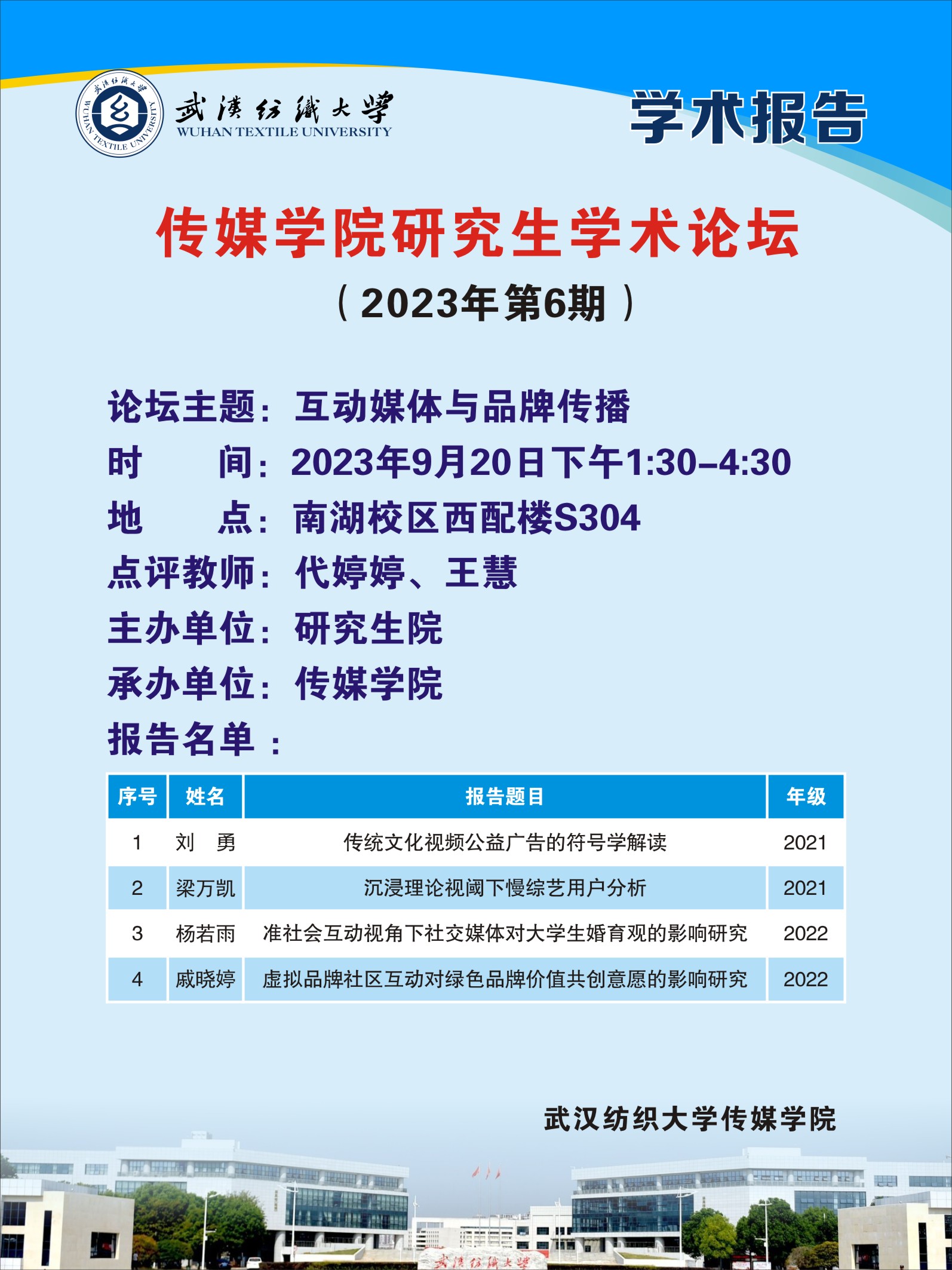 9月20日下午,365英国上市在西配楼S304室举行2023年第6期研究生学术论坛。此次论坛采用线上线下相结合的方式,由2021级广播电视专业的刘勇、梁万凯和2022级新闻与传播专业的杨若雨、戚晓婷4位同学围绕“互动媒体与品牌传播”主题进行分享汇报。团队其他相关研究生参与旁听。硕士研究生指导老师代婷婷副教授担任论坛主持人,王慧老师指导并进行答疑点评。