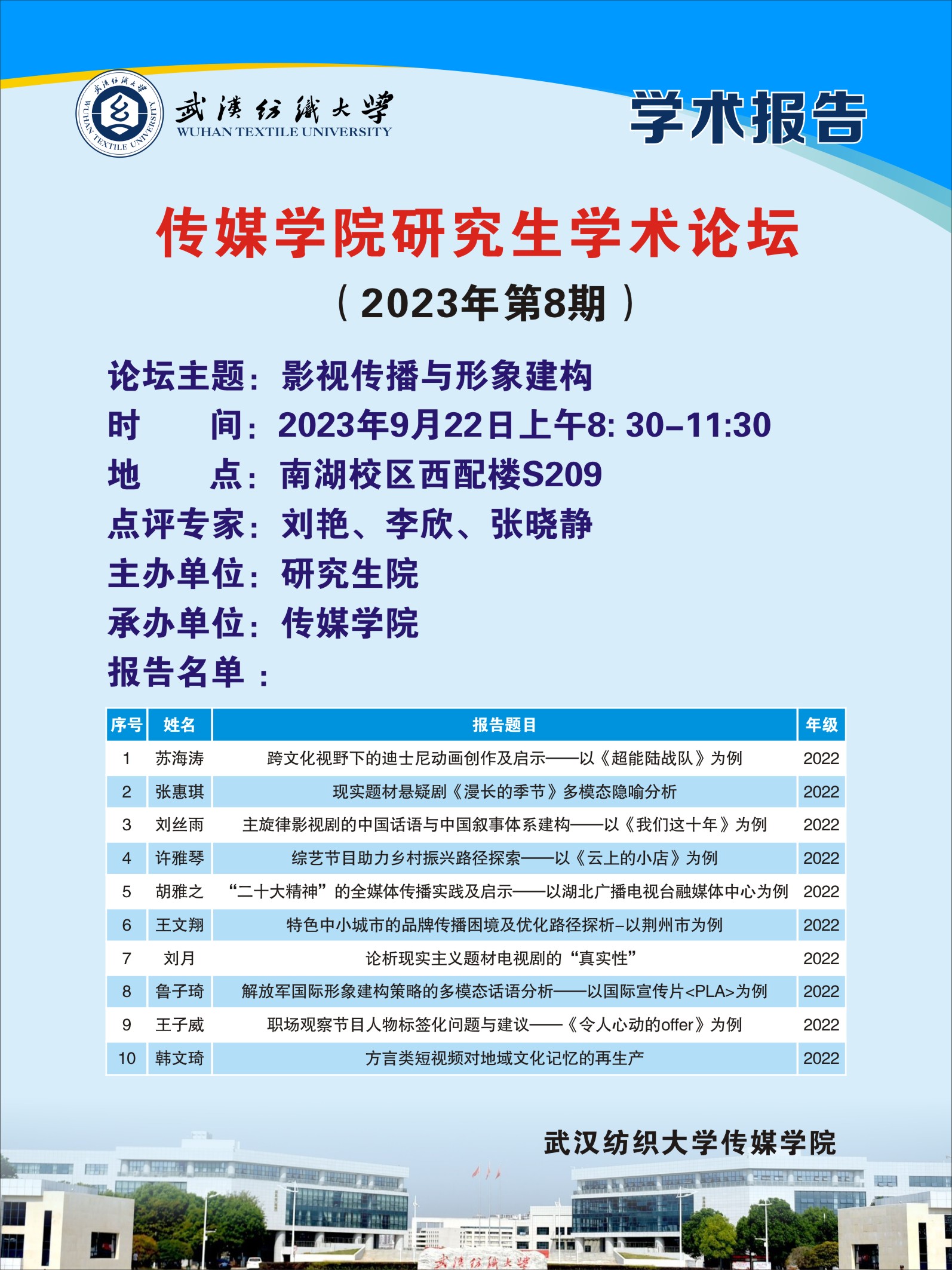 为促进学术交流,提高学术水平,研究生提供一个展示自己研究成果的平台,9月22日上午,365英国上市2023年第8期研究生学术论坛顺利举行。此次论坛的主题为“影视传播与形象构建”,365英国上市副教授刘艳、李欣和张晓静三位老师出席本次论坛,22级10名硕士研究生在会场进行主题汇报,部分23级新闻与传播专业、广播电视艺术专业研究生参会。