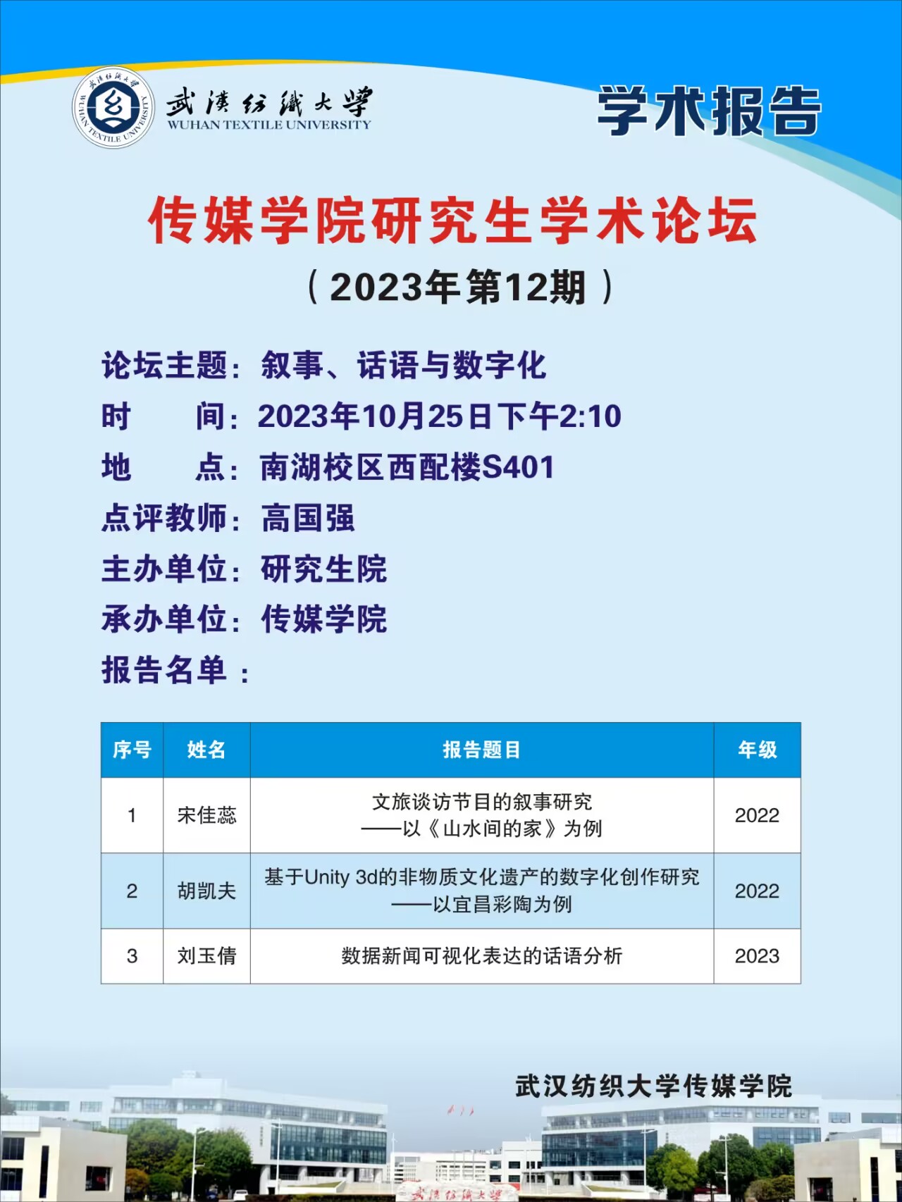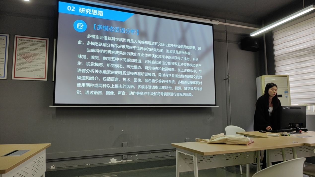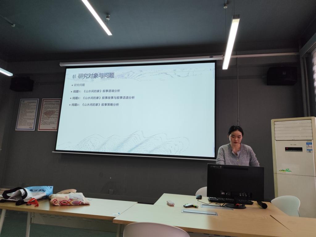 2022级新闻与传播专业研究生宋佳蕊选取创新性采用“双线并行”叙事架构的文旅访谈节目《山水间的家》为例,从叙事语境、叙事故事与叙事话语以及叙事策略三个视角探讨真人秀节目的叙事研究与表现;2022级艺术设计专业研究生胡凯夫基于Unity3d的非遗数字化创作,聚焦虚拟环境和交互设计,探讨宜昌彩陶的三维数字重现及文化传播路径,为保存和传承非物质文化遗产提供全新的实践方式;2023级新闻与传播专业的研究生刘玉倩以研究数据新闻新范式——话语分析法讲解了数据新闻的相关研究热点。她从数据新闻的含义和特征、话语分析法的天然优势及现实应用价值进行全面分析阐述。